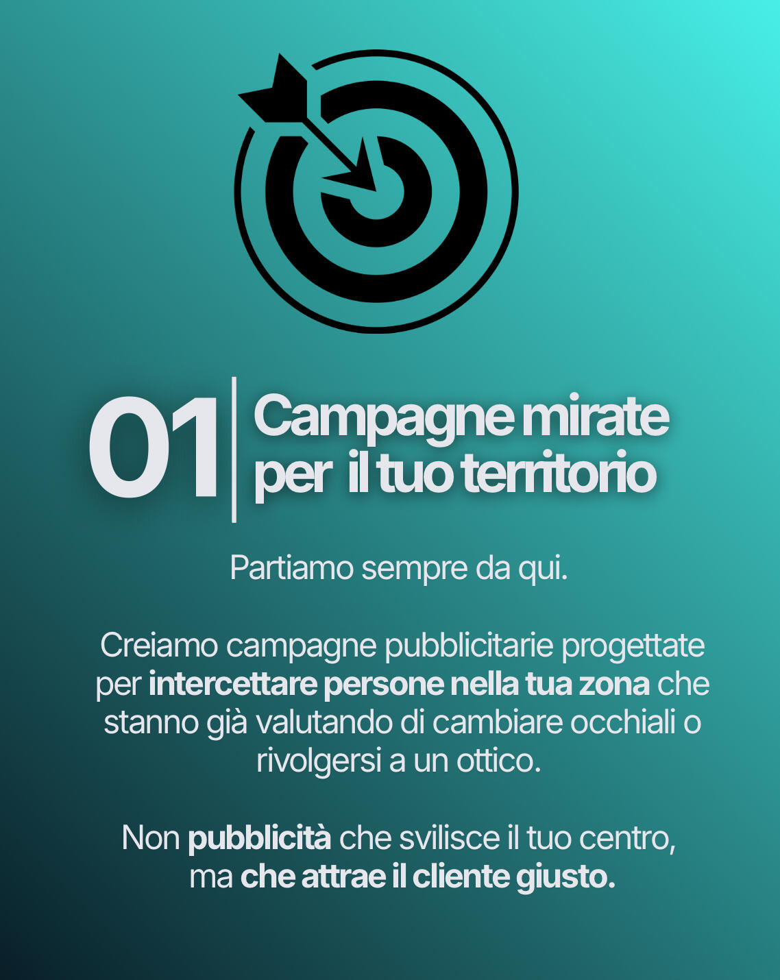 Non è un problema. Le campagne sono costruite specificamente per il tuo territorio e vengono ottimizzate per intercettare le persone giuste nella tua zona.Anche in aree meno dense, ci sono persone che cercano un ottico di fiducia.
