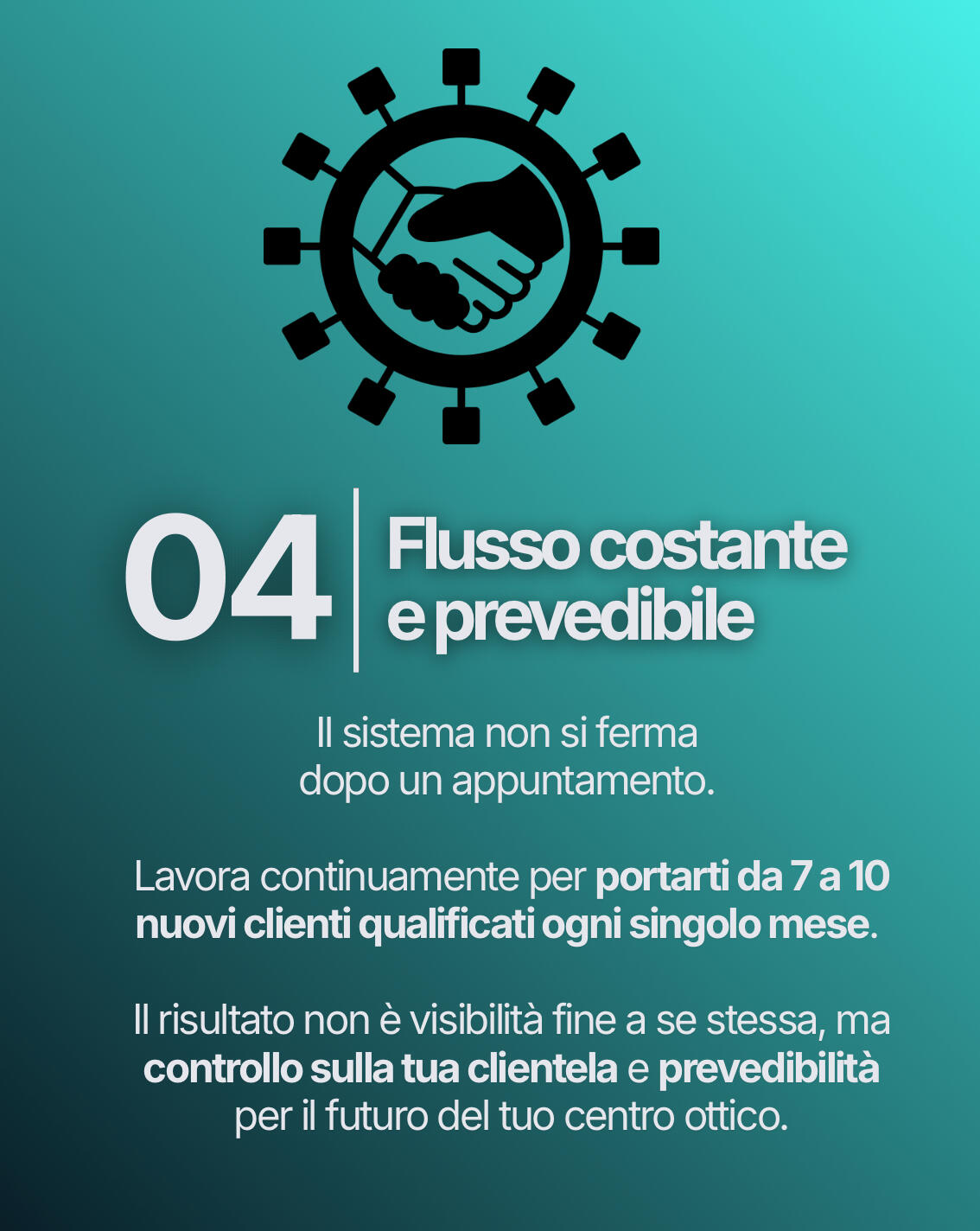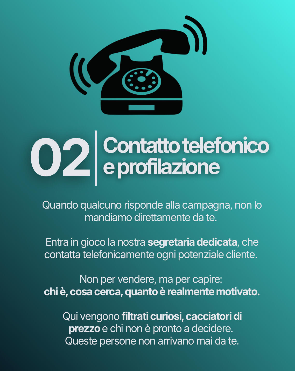 Senza cacciatori di prezzo.Creiamo un sistema completo che intercetta potenziali clienti, li qualifica, e fissa appuntamenti direttamente nel tuo centro.Così quando una persona entra da te non è "uno che dà un'occhiata".È un cliente già predisposto a sceglierti.Perché oggi non vince chi è più bravo.Vince chi riesce a farsi scegliere prima ancora dell'incontro.E noi ti portiamo esattamente questo: controllo sulla tua clientela.