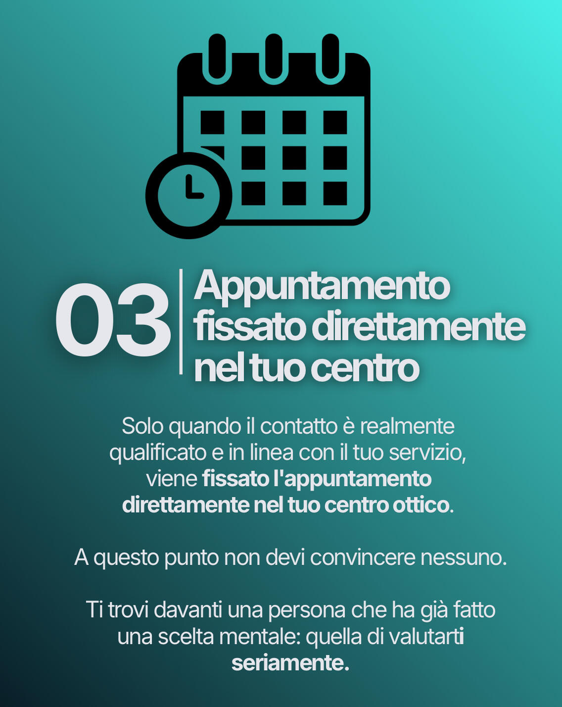 Senza cacciatori di prezzo.Creiamo un sistema completo che intercetta potenziali clienti, li qualifica, e fissa appuntamenti direttamente nel tuo centro.Così quando una persona entra da te non è "uno che dà un'occhiata".È un cliente già predisposto a sceglierti.Perché oggi non vince chi è più bravo.Vince chi riesce a farsi scegliere prima ancora dell'incontro.E noi ti portiamo esattamente questo: controllo sulla tua clientela.